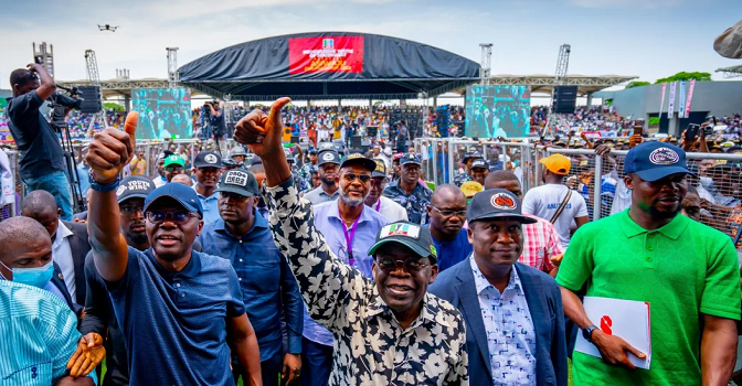 Asiwaju Ahmed Bola Tinubu (centre) and Governor Babjide Sanwo-Olu of Lagos State at the Youths' Rally in Lagos