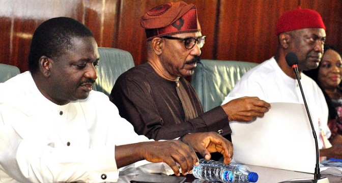 Mr. Femi Adesina, Special Adviser to the President on Media Nad Publicity (l) and Dr. Olorunnimbe Mamora, Honourable Minister for Science, Technology and Innovation, and Other Officials at Ministerial Media Briefing, in the State House, in Abuja, FCT