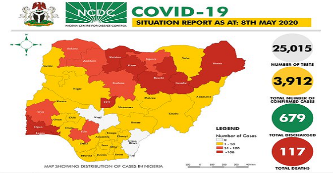 Meanwhile, as of Friday, May 8, the country according to the Nigeria Centre for Disease Control (NCDC) disclosed in a tweet via its verified twitter account, that Nigeria confirmed 386 new cases, making the total number of Coronavirus cases 3, 912 with 679 discharged patients and 117 deaths.