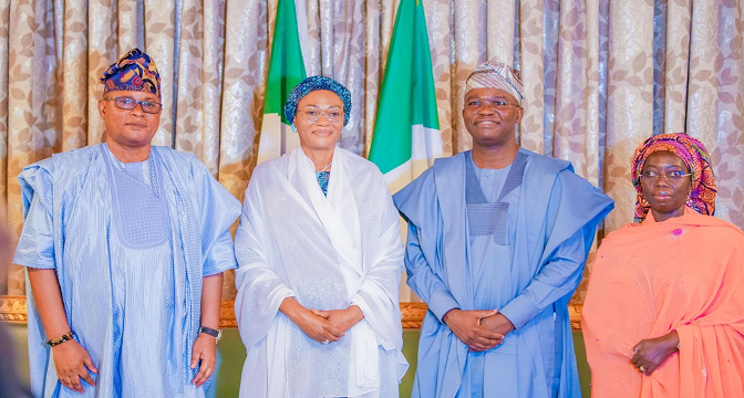 L-R: Senator Representing Lagos-Central and Chairman Senate Committee on Marine Transport, Senator Wasiu Eshinlokun Sanni; First Lady, Senator Oluremi Tinubu, CON; Senator Representing Lagos-East and Chairman Senate Committee on Banking and Finance, Senator Adetokunbo Abiru; and Senator Representing Lagos-West and Chairman, Senate Committee on Social Welfare and Poverty Alleviation, Senator Oluranti Adebule, During a Courtesy Visit to the First Lady in Her office, at the State House, Abuja, FCT