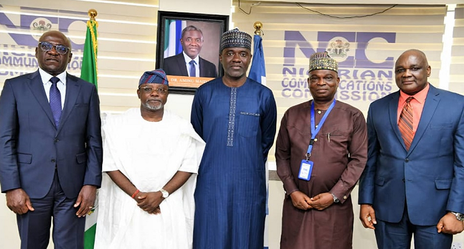 L-R: Engr. Abraham Oshadami, Executive Commissioner Technical Services at NCC; Otunba Biodun Ajiboye, Executive Secretary/CEO of NICO; Dr. Aminu Maida, Executive Vice-Chairman/CEO of NCC; Mr. Michael Ekoko, Director of Research and Documentation at NICO; and Mr. Reuben Muoka, Director Public Affairs of NCC, During Ajiboye’s Courtesy Visit to the Commission's Corporate Headquarters, Abuja, FCT        Photo: NCC