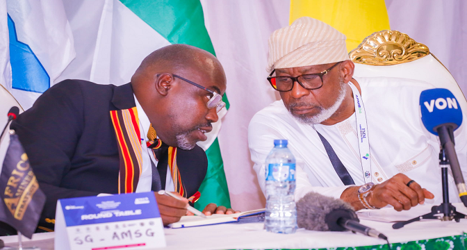 Dr. Oladele Alake, Nigeria's Honourable Minister for Solid Minerals Development (r); and H.E. Moses Michael Engadu, Secretary-General of African Mineral Strategy Group, During a Ministerial Roundtable at the African Natural Resources and Energy Investment Summit, in Abuja, FCT       Photo: State House