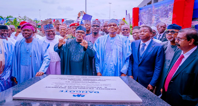 Former President Muhammadu Buhari (middle), Aliko Dangote (4th left), and Other Dignitaries at the Commissioning of Dangote Petroleum Refinery May 2023, at Ibeju-Lekki, in Lagos State