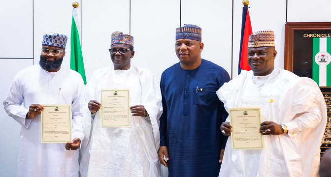 L-R: Mr. Khalil Suleiman Halilu, Executive Vice-Chairman/CEO of NASENI; Dr. Bello Mohammed Matawalle, MON, Honourable Minister of State for Defence; Prince Shuaibu Abubakar Audu, Honourable Minister for Steel Development; and Dr. Ibrahim Abubakar Kana, mni, Permanent Secretary of the Ministry of Defence, at the MoU Signing, in Abuja, FCT Photo: NASENI