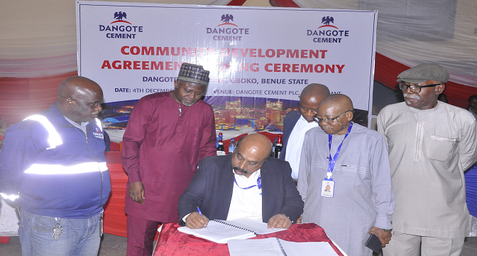The Dangote Cement Plc signed the agreement with six host communities, including Tse-kucha (Mbatyula), Quarry, Amua (Mbakper), Mbazembe, Mbatur and Pass Brothers.