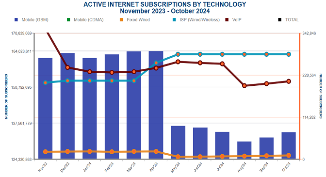 The telecoms sector regulatory Commission also reported via its coporate Web site that the total Active Internet Subscriptions by Technology between November 2023 and October 2024 was total 134,787,935 with Mobile (GSM) recording 134,279,501; Fixed Wired 10,661; ISP (Wired/Wireless) hitting 285,702 while the VoIP recorded 212,071 respectively as of October this year.