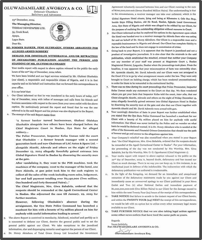 The demand also reads in part: “We have been briefed and our legal services retained by Mr. Olufemi Olushakin (our client), a respectable and responsible citizen of Nigeria, and it is in that capacity and on his behalf and instruction that we forward this correspondence to your office.”