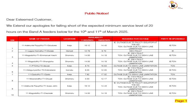 *The Management of the Ikeja Electricity Distribution Company Plc announce the downgrade of two feeders from Band A to Band B category in Oke Ira and Ijegun areas of Lagos State, as the DisCo apologises for falling short of the 20-hour expected minimum service level on 81 Band A feeders March 10-11, 2025