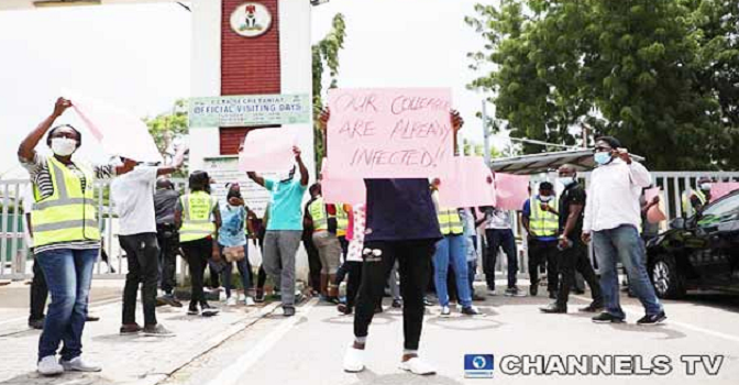 Some carried placards with the inscriptions “Our colleagues are already infected,” “Payout three months allowances,” in pressing home the demand for payment of their outstanding allowances.