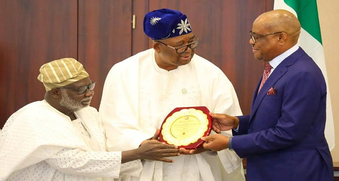 R-L: Barr. Nyesom Wike, Honourable Minister for the FCT; Chief Adegboyega Awomolo (SAN), Chairman, Body of Benchers; and Olukayode Ariwoola, GCON, Former Chief Justice of Nigeria, During the Body's Visit to the Minister's Office, in Abuja, FCT Photo: NyesomWike