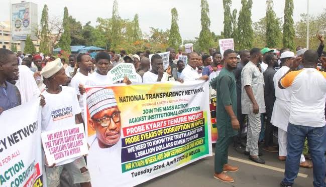 Several protesters Tuesday, April 22, 2025, stormed the Office of the Attorney-General of the Federation and Minister for Justice at the Federal Ministry of Justice Headquarters, in Abuja, FCT, to demand a probe of Malam Mele Kolo Kyari, immediate past Group Chief Executive Officer (GCEO) of the Nigerian National Petroleum Company Limited (NNPCL) for alleged infractions while in office.