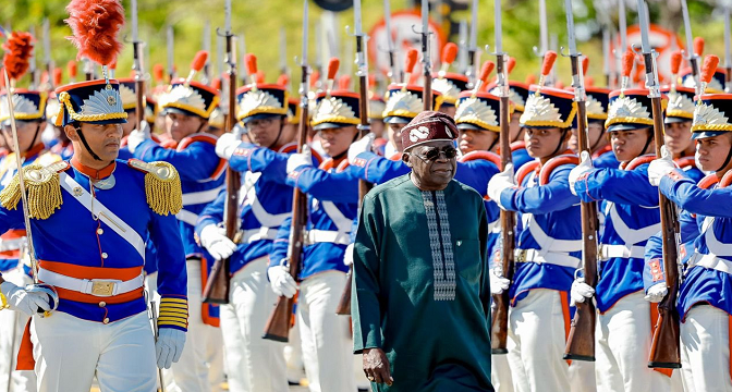 President Tinubu inspecting the guard of honour in upon arrival in Brazil