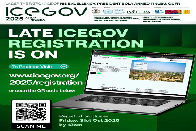The National Information Technology Development Agency (NITDA) has extended the intending participants’ late registration timeline for the ICEGOV 2025 till Friday, October 31 this year, by 12:00 a.m.