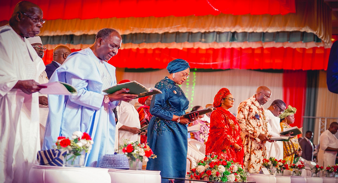 Former President Olusegun Obasanjo, making his first appearance at a state function in the Presidential Villa, Abuja,  since President Bola Ahmed Tinubu’s inauguration read the 2nd Lesson from Genesis 22:15-18, emphasising God’s covenant of blessing through obedience.