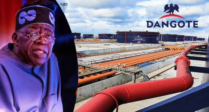 Photo Collage of President Bola Ahmed Tinubu and Dangote Petroleum Refinery