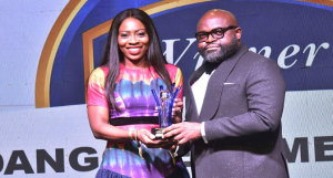 Temilade Aduroja, Group Head, Investor Relations at Dangote Industries Limited (l), Receiving the Award on Single Largest Corporate Debt Issue on FMDQ for Dangote Cement Plc from Ayodele Onawunmi, Managing Director of FMDQ Clear Limited, at the 7th Annual FMDQ Gold Awards Night, in Lagos Photo: Dangote Group