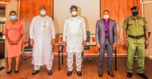 L-R: Dr. Etinosa Imagbenikaro; Barrister Ismaeel Ahmed; Mr. Sunday Dare, Youth and Sports Development Minister; PS, FMYSD Mr. Gabriel Aduda; and Brigadier General Ibrahim Shuaibu, Director-General of NYSC, in Abuja, FCT. Credit: FMYSD