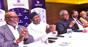 L-R: Non-Executive Director, Dangote Packaging Limited, Robert Ade-Odiachi; Chairman, FBN Holdings Plc, Mr. Femi Otedola; President/CE, Dangote Industries Limited Aliko Dangote; Vice-President, Oil & Gas, Dangote Industries Limited, Devakumar Edwin; Group Executive Director, Commercial Operations, Dangote Industries Limited, Fatima Aliko-Dangote, at the World Press Conference on the Expansion of Dangote Petroleum Refinery and Petrochemicals Limited, in Lagos Photo: DIL