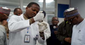 L-R: A Lab Analyst at the Dangote Petroleum Refinery; Aliko Dangote, President/CE of Dangote Industries Limited (DIL); Hon. Benjamin Kalu, Deputy Speaker of the Nigerian House of Representatives; Rt. Hon. (Dr.) Abbas Tajudeen, Speaker of the House, and Others Watching While Conducting a Lab Test Analysis of Diesel Quality During the Federal Lawmakers’ Visit to Dangote Petroleum Refinery & Petrochemicals and Fertiliser Plant, at Ibeju-Lekki, in Lagos Photos: DIL
