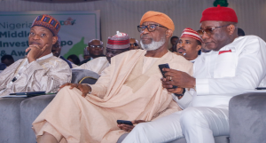 Dr. Oladele Alake, Honourable Minister for Solid Minerals Development and Chairman, Organising Committee of African Industrial & Development Conference and Awards (middle); Dr. Allen Onyeama, Chairman of Air Peace Airlines (r); and Amb. Usman Sarki (l), at the Event, in Abuja, FCT            Photo: State House