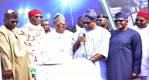 L-R: Governor AbdulRahman AbdulRasaq of Kwara State; Hon. Benjamin Okezie, Deputy Speaker House of Representatives; H.E Engr. Sen. David Umahi; Senate President Godswill Akpabio, Representing President Bola Ahmed Tinubu; Aliko Dangote, President/CE of Dangote Industries Limited; and Governor Hope Odidika Uzodinma of Imo State, at the Official Commissioning of the DIL-Reconstructed Apapa -Oworonshoki - Ojota Expressway, in Lagos           Photo: Dangote Group