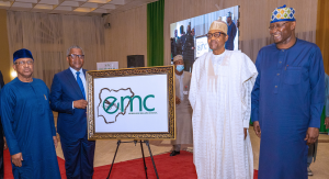 L-R: Dr Osagie Ehanire, Honourable Minister for Health and Chairman of NEMC; Alhaji Aliko Dangote, President of Dangote Group; President Muhammadu Buhari; and Mr. Boss Mustapha, SGF, During the Launch of NEMC in the Presidential Banquet Hall, State House, Abuja, FCT Photo: Sunday Aghaeze