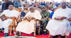 President Bola Ahmed Tinubu (middle), Governor Caleb Manasseh Mutfwang of Plateau State (l); and Prof. Nantawe Yilwatda, Chief Mourner and National Chairman of APC, at the Funeral Prayers for Late Mrs. Nana Lydia Yilwatda in Jos, Plateau State Capital Photo: State House