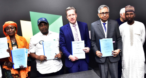 L-R: Dr. Deborah Usman, Company Sec./Legal adviser, NNPC Gas Marketing Limited ( NGML); Declan O. Nwokoro MD NNPC Gas Marketing Company Limited; David Bird, CEO, Dangote Petroleum Refinery; Arvind Pathak, GMD/CEO, Dangote Cement Plc; Sadiq Mandara, Principal Productions /Process Engineer, Dangote Fertiliser Limited; During the Dangote Industries Limited, Signing of MoU gas agreements with NNPC For Usage of Dangote Petroleum Refinery, Fertilizer and Cement, in Abuja, FCT Photo: DIL