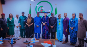 Dr. Aminu Maida, Executive Vice-Chairman/CEO of NCC, and Ms. Hadiza Bala-Usman, Special Adviser to the President on Policy and Coordination at the CRDCU Office (centre) in a Group Photograph with the Commision's Management During a Visit to the CRDCU Office, in Abuja, FCT Photo: NCC