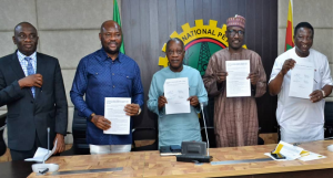 L-R: Alh. Yusuf Lawal Othman, National President, NARTO; Comrade Williams Akporeha, National President, NUPENG; Abiodun Adeniji, ED F&A, NMDPRA; Malam Mele Kyari, Group Managing Director/CEO of NNPC Limited; and Otunba S.A Oladiti, Chairman of PTD at the NNPC Towers, Abuja, FCT Photo: NNPC